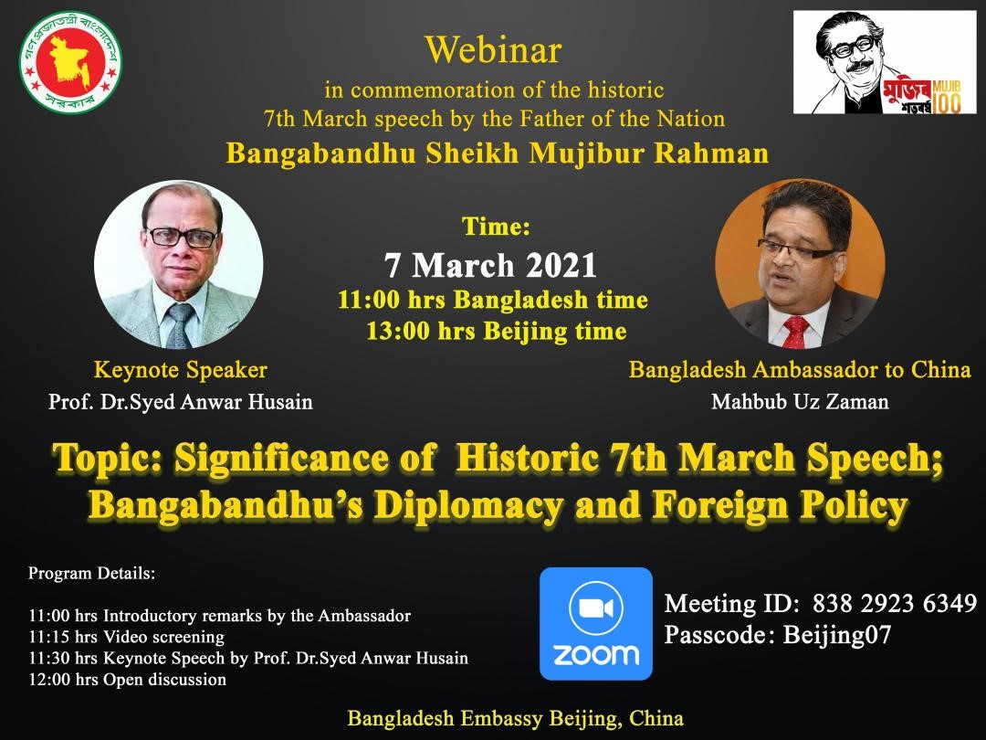 3月7日,304永利集团孟加拉语专业师生受邀参加孟加拉国驻华大使馆举办的纪念孟加拉国国父“3月7日历史性讲话”线上活动暨研讨会。研讨会于北京时间3月7日13:00开始,孟加拉国驻华大使马赫布·乌兹·扎曼先生和达卡大学赛义德·安瓦尔·胡赛因先后做主题发言。之后曾琼教授受邀作为第一位嘉宾进行了发言。