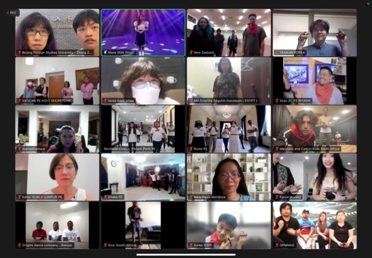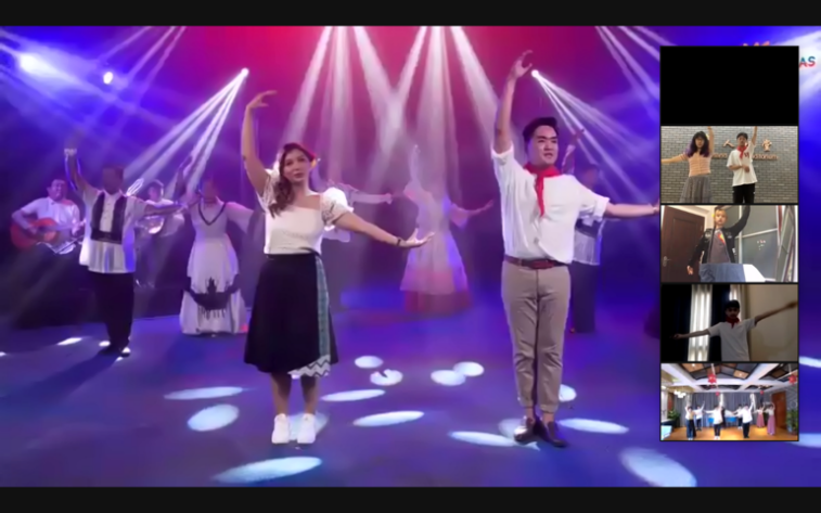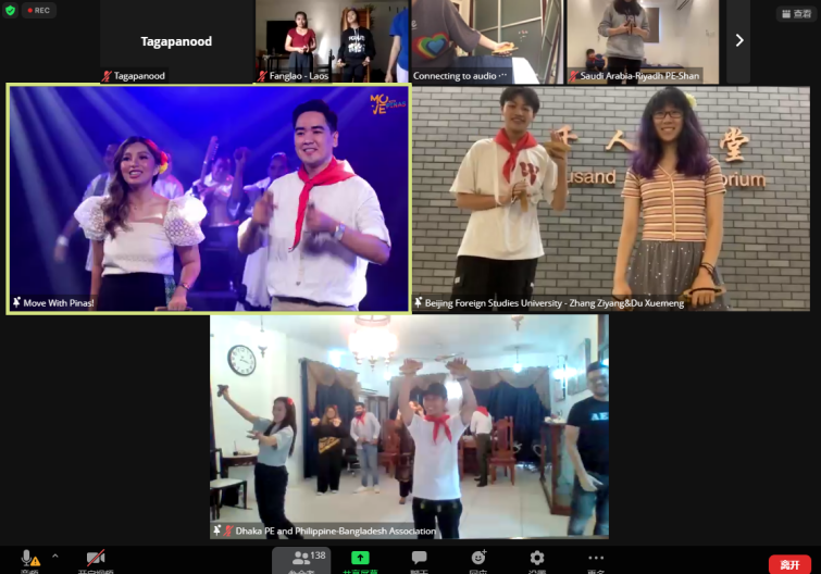 在学习成果展示环节,杜雪萌、张梓洋同学积极举手参与,与来自其它国家的伙伴隔空互动,在舞蹈中体验菲律宾文化;石惟扬同学在活动大屏上发言,表达了参与活动的激动心情与对主办方的感谢,受到主办方的赞赏。在舞蹈活动最后,北外菲律宾语员工代表手持舞蹈道具、穿戴菲律宾民族传统饰品,于会议公屏上与各国参与者共欢共舞。在跨文化的交流学习下,四名同学不仅领略了对象国热情洋溢的民俗,而且更深刻地感受到对象国文化的生命力与感染力,也将以更饱满的朝气投入到对象国语言的学习中。