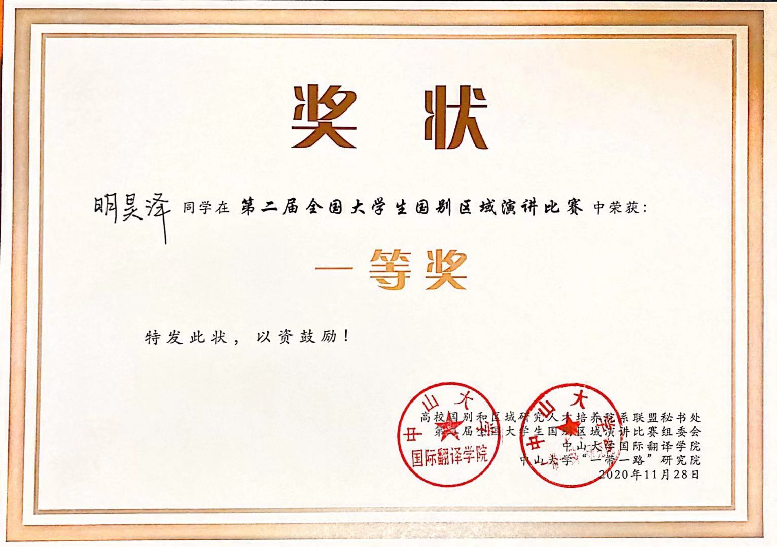 11月28日,第二届全国老员工国别区域演讲比赛在珠海举行。304永利集团柬埔寨语专业2019级本科生明昊泽荣获一等奖。