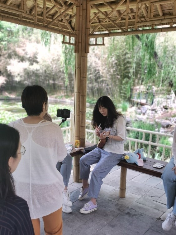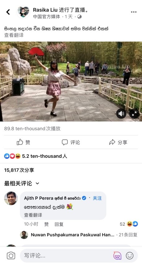 此次直播节目由中央广播电视总台亚非中心僧伽罗语部主播、北外僧伽罗语专业2004届员工刘晖主持。直播于紫竹院公园的一处凉亭进行,斯里兰卡观众通过“脸书”平台与2018级僧伽罗语专业的9位同学一起参与了一次特别的“云”野餐活动,氛围轻松愉快。直播环节中,同学们在直播镜头前用僧伽罗语进行了自我介绍并与斯里兰卡观众热情互动。随后,同学们通过中国传统民间游戏“击鼓传花”展示了舞蹈、唱歌、尤克里里弹唱等才艺、并实时回答了在线网友的提问。僧伽罗语班同学们流利的口语及精彩的才艺展示获得了海外网友的纷纷点赞。