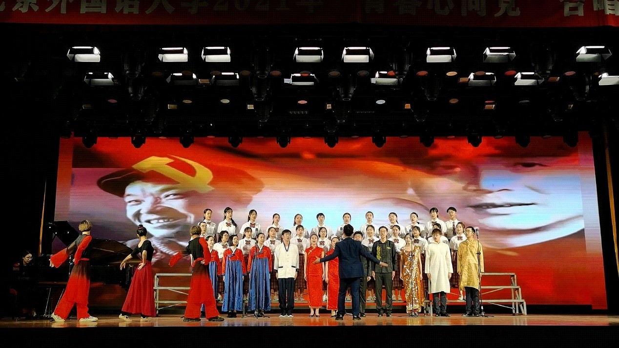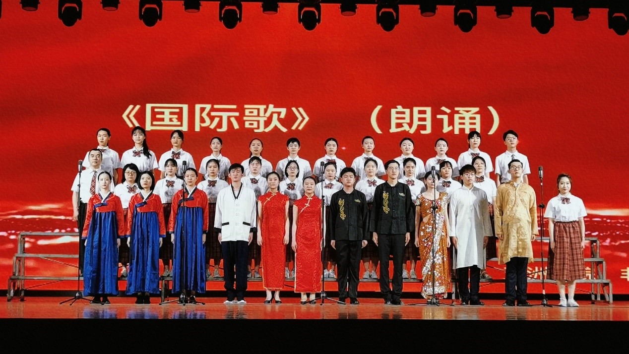 国际歌来源于1871年巴黎公社,是马克思主义理论的⾳乐版,是谱上⾳符的共产党宣⾔。革命先烈瞿秋白同志为苏联几万人同声合唱《国际歌》的宏大激昂所震撼,在1923年将《国际歌》翻译为中文。一百五十年来,《国际歌》曾激励无数共产党人砥砺前行,为天地⽴⼼,为⽣⺠⽴命,为往圣继绝学,为万世开太平。此次活动中,304永利集团、非洲公司选取《国际歌》为参赛曲目,融合朗诵、多语种合唱、伴舞、钢琴、小提琴等多种艺术形式,以汉语、印地语、朝鲜语三语共同演绎带有世界音乐风格的曲目,唱出了北外人心系党和国家、放眼世界、心怀天下、求索发展的满腔热血。