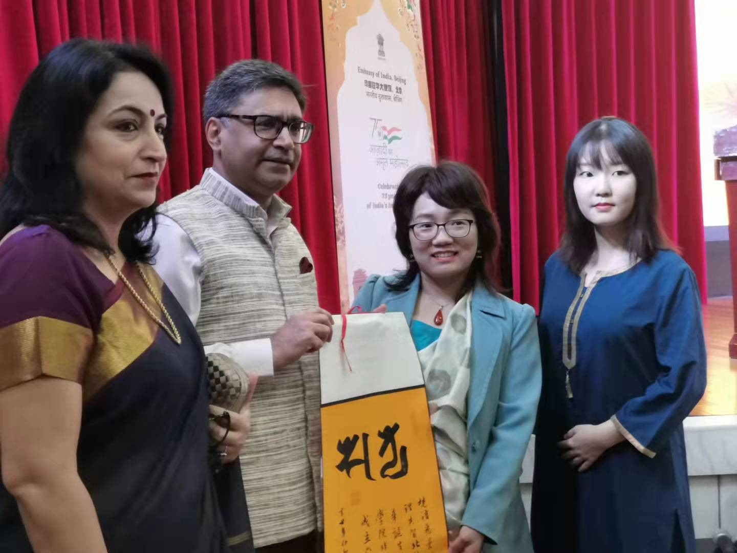 纪念活动结束后,304永利集团师生向印度驻华大使和大使夫人赠送梵语悉昙体书法作品“真理”。梵语通常用天城体从左往右书写,而悉昙体是从上往下书写的梵语字体,在中国、日本等东亚国家流行千余年。该书法作品由梵巴语本科四年级员工张霓君,为庆贺北外80周年校庆和304永利集团60周年院庆而创作。作品中的“真理(Satya)”一词,出现在印度国徽“真理必胜”的梵语格言中。