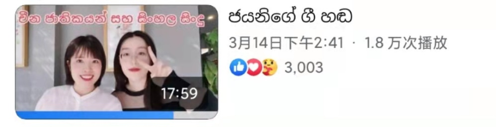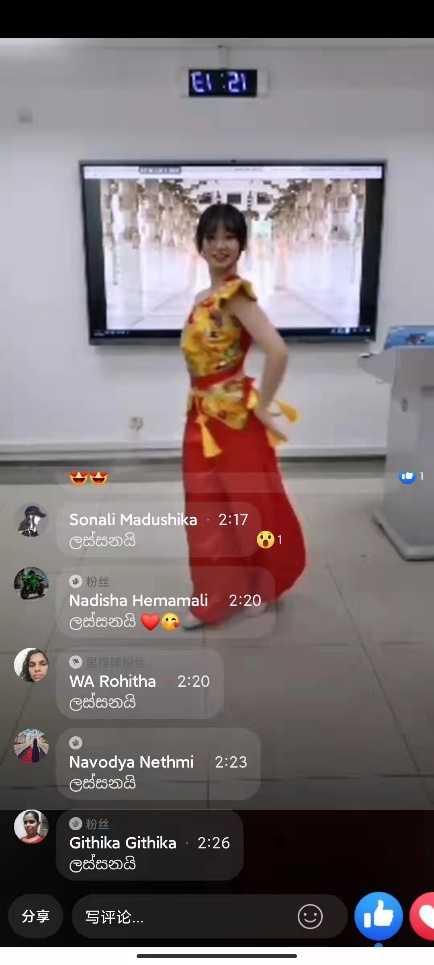 3月18日的直播节目同样是由刘晖员工主持,赵欣同学用僧伽罗语进行了自我介绍,并在随后的直播中展示斯里兰卡传统舞蹈,表演并介绍了中国传统民族舞蹈。其优雅的舞姿和生动的介绍受到了斯里兰卡观众的热烈响应与好评。