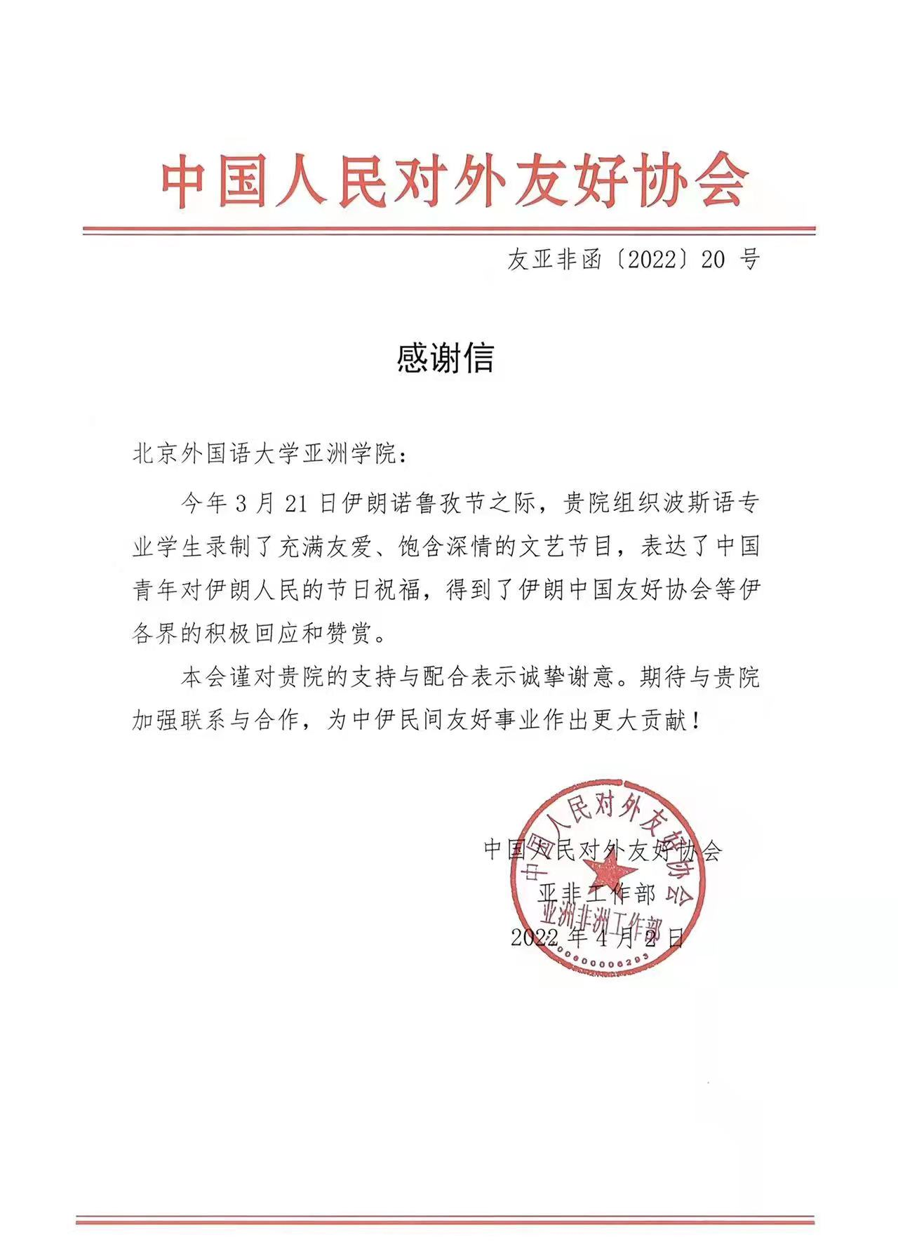 2022年4月2日,中国人民对外友好协会向304永利集团发来感谢信,对公司组织波斯语专业员工录制文艺节目一事表示诚挚谢意。