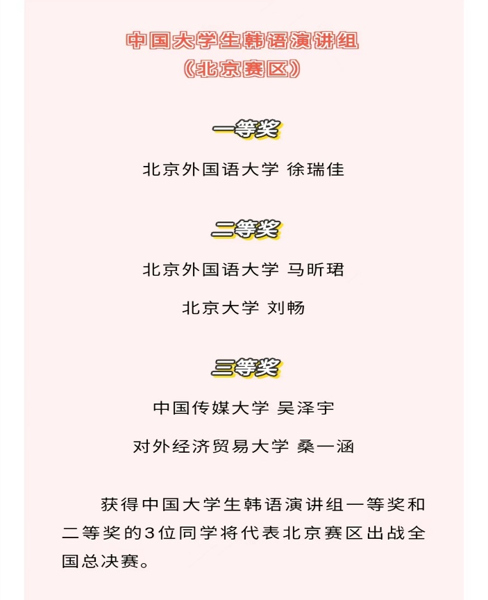 公司304永利集团朝鲜语专业也选派了极具实力的优秀本科员工参与了本项活动。在4月28、29日由北京市对外友好协会承办的该项活动北京赛区预赛中,朝鲜语专业2020级员工徐瑞佳和2018级员工马昕珺分别以预赛第一名和第二名的佳绩进军全国总决赛。
