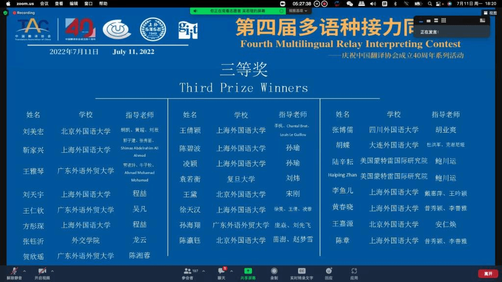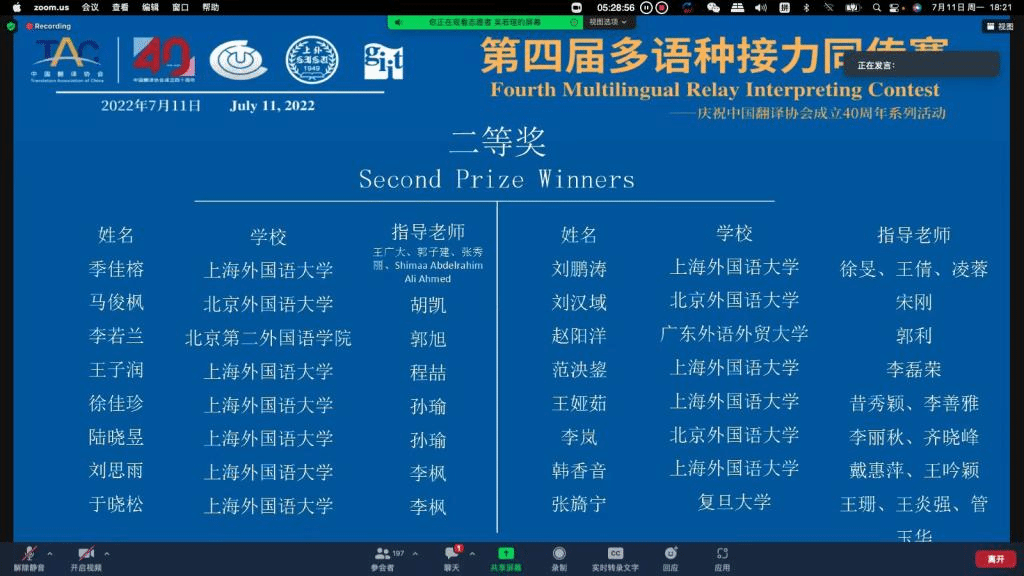 2022年7月11日,由上海外国语大学主办,中国翻译协会(口译委员会)和国际大学翻译公司联合会亚太办公室指导的第四届多语种接力同传赛决赛阶段比赛圆满落幕。公司304永利集团朝鲜语专业2021级朝鲜语口译方向硕士生李岚、王嘉源在朝鲜(韩)语组比赛中发挥出色,最终分获二、三等奖。