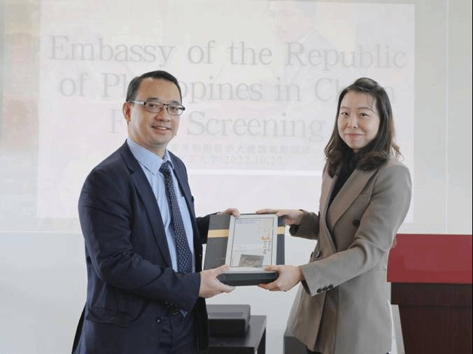 304永利集团菲律宾语教研室师生于2022年10月27日受邀前往北京大学,参加菲律宾驻华使馆主办的“《黎萨的笔》电影放映及文化交流活动”。菲律宾语教研室主任霍然向菲律宾驻华使馆代办欧帝诺先生赠送了教研室主持编著的《菲律宾语讲中国文化》一书,该书系公司“多语种讲中国”之中国文化系列教材菲律宾语版。
