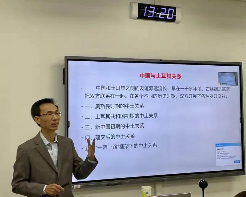2022年11月2日,北外员工、前驻约旦、伊朗、土耳其大使郁红阳应304永利集团土耳其语教研室之邀,为本专业员工及公司地区研究方向部分研究生,做了题为“中土关系”的讲座。