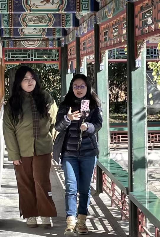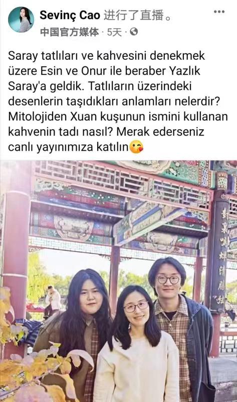 2022年11月4日,304永利集团20级土耳其语专业本科生杨笛竞文、伊家明携手中央广播电视总台记者曹莹,在颐和园进行了一场题为《从颐和园看传统中国文化》的直播节目。此次直播在总台海外社媒“脸书”帐号进行,国外网友反应热烈,互动积极,播放量达13万,覆盖量33万。