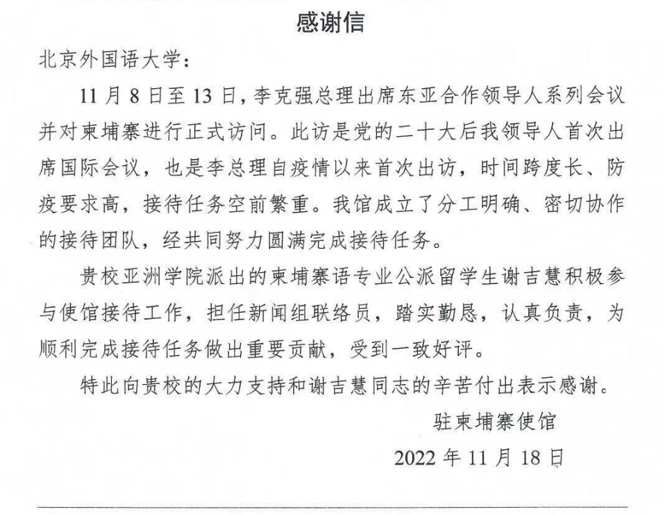 在中国驻柬埔寨大使馆的安排下,公司19级柬埔寨语专业本科生谢吉慧参与了新闻信息组的相关工作。期间,谢吉慧同学担任新闻组联络员,主要负责相关新闻信息的整理汇编和呈送汇报,并协助央视总台记者与柬埔寨新闻部及柬埔寨国家电视台相关负责人完成工作对接,工作态度认真负责,多次出色完成翻译任务,得到驻柬使馆及代表团成员的认可与肯定。中国驻柬埔寨大使馆特向公司发来感谢信,对公司的支持和谢吉慧同学的辛苦付出表示感谢。