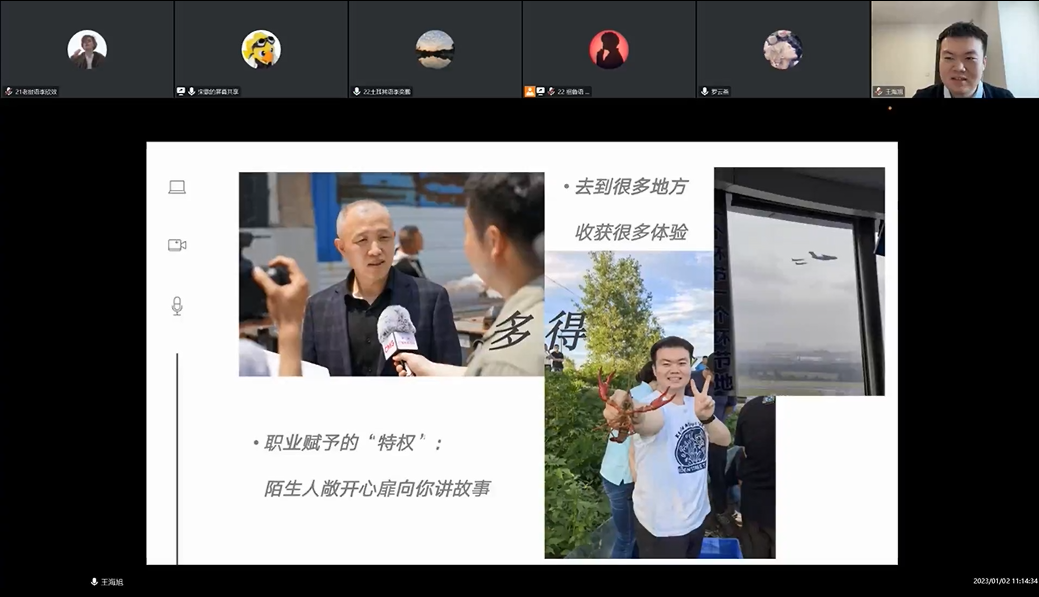 首先由黄昕欣进行分享,黄昕欣现为新华通讯社对外新闻编辑部英文记者。她从工作体验、如何成为一名新闻媒体人、大学经历、如何寻找实习机会、新华社介绍及校招备考经验六个方面进行分享。她认为,要成为新闻媒体人,首先要对工作有足够的热情;其次要踏实能吃苦;最后要有扎实的专业能力。黄昕欣还介绍了新华社校招流程,并给出简历填写、笔试等方面的建议。