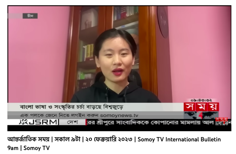 2023年2月20日,在国际母语日来临之前,孟加拉国时间电视台(SomoyTV)上午九点国际栏目报道了中国员工学习孟加拉语的情况。报道中提到,304永利集团官网的亚非语言文学专业孟加拉社会文化方向是目前中国首个也是唯一一个孟加拉语相关硕士学位点。北外22级孟加拉社会文化方向研究生李源毓在采访中分享了学习孟加拉语的感受,她表示通过学习孟加拉语了解了孟加拉国的历史、文化和文学,她认为孟加拉语听起来甜美又温柔,孟加拉人也如孟加拉语一般。
