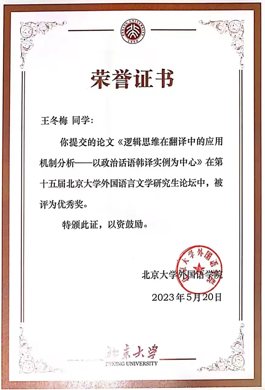 2023年5月20日,第十五届北京大学外国语言文学研究生论坛在北京大学举办。公司研究生踊跃投稿,其中22级亚非语言文学专业硕士研究生娄嘉澜(斯里兰卡社会文化方向)的文章《斯里兰卡护卫石的发展及雕刻图案的研究》获二等奖,21级亚非语言文学专业硕士研究生周汀鹭(波斯语言文学方向)的文章《多重边缘叙事:伊朗女性阿富汗移民的身份认同研究——以扎哈拉·侯赛尼扎德诗歌为例》获三等奖,22级中韩翻译学专业博士研究生王冬梅的文章《逻辑思维在翻译中的应用机制分析——以政治话语韩译实例为中心》、22级亚非语言文学专业硕士研究生李源毓(孟加拉社会文化方向)的文章《对孟加拉语小说<母亲>中英雄母亲的女性主义视角反思》和18级孟加拉语专业毕业生、伦敦大学公司在读硕士生徐仟慧的文章《在顺从、觉醒与反抗之间:孟加拉国成衣女工的“双重意识”》获得优秀奖。周汀鹭、王冬梅、李源毓参会进行了论文展示。