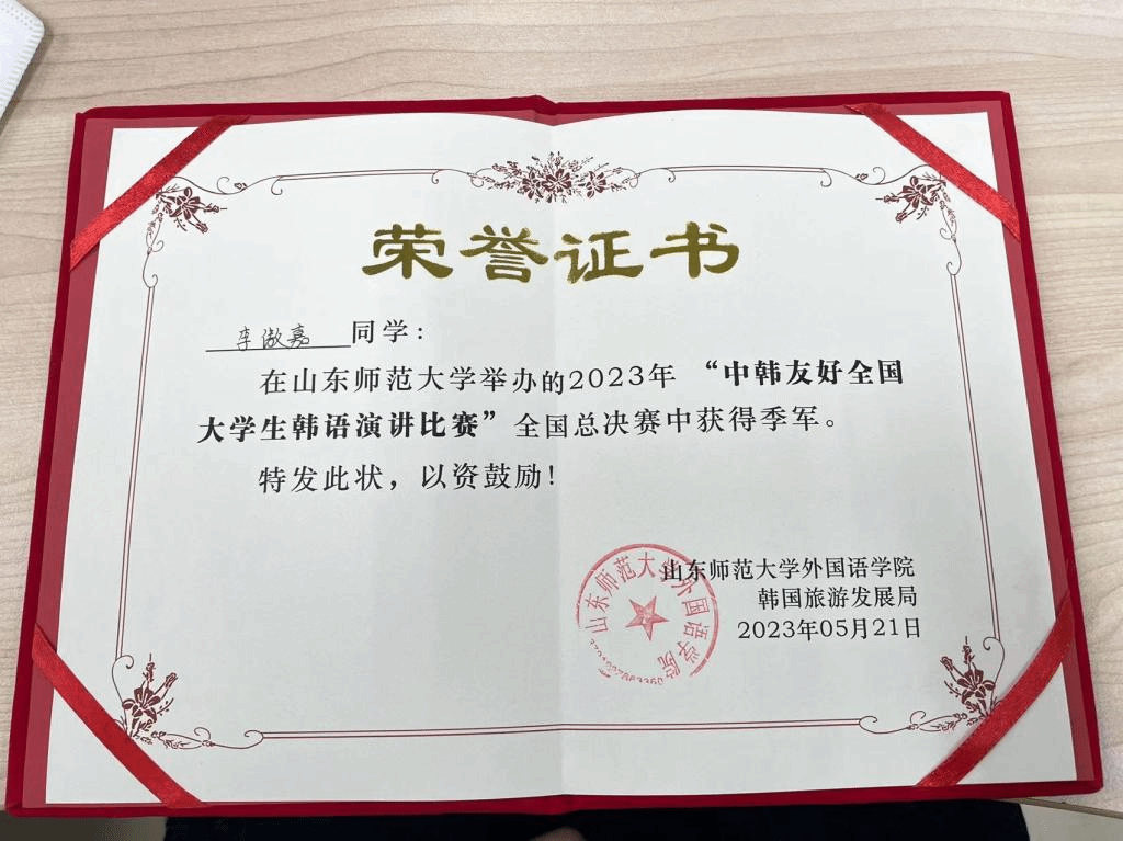 在5月21日举行的全国总决赛中,李傲嘉同学延续了出色的发挥。虽然学习韩国语尚不满两年,且面对众多高年级竞争对手,李傲嘉同学仍凭借扎实的韩语功底、出色的语言表达和敏捷的应变能力,得到评委们的高度评价,在参加决赛的15位选手中名列前茅,最终获得全国总决赛季军的佳绩。