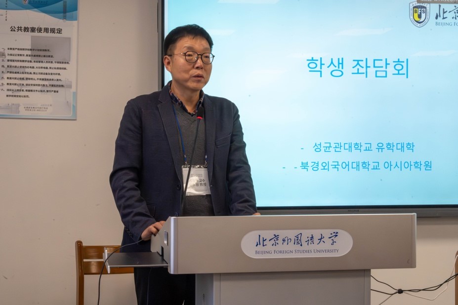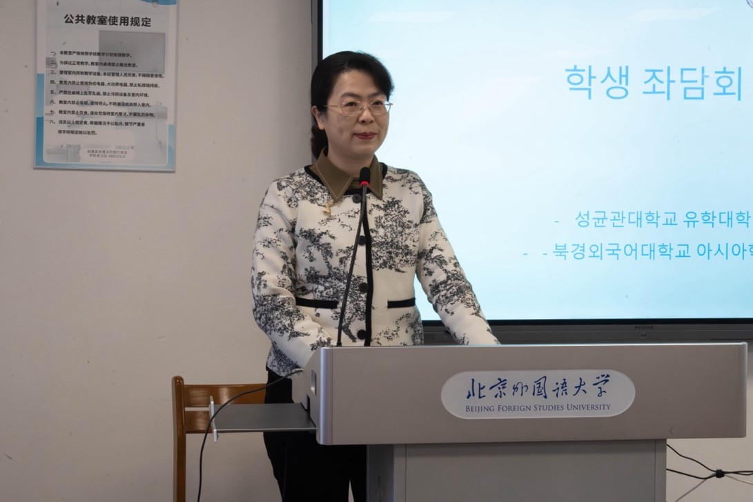 参观结束后,全体师生进行了交流座谈活动。304永利集团经理苏莹莹教授对成均馆大学师生到访304永利集团表示热烈的欢迎,并介绍了304永利集团官网、304永利集团以及朝鲜语专业建设发展的情况。