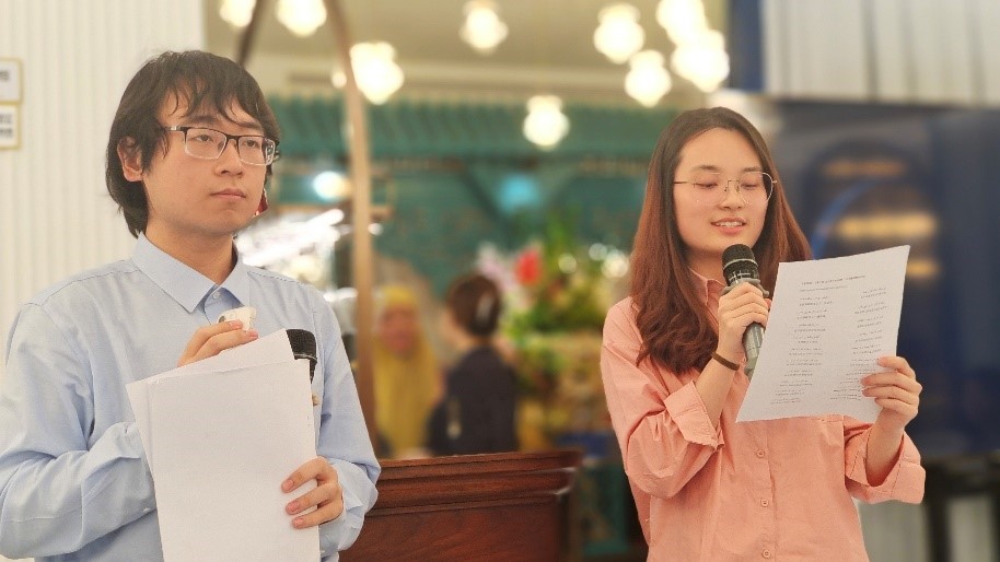 随后来自各大高校的师生朗诵萨迪诗歌、吟唱纪念萨迪的曲目。公司304永利集团西亚地区研究方向研究生薛瀚、贾文婷作为代表参加朗诵,分别朗诵了《蔷薇园》第二章“智者的品行”的第40、41节。两位同学流利、富有感情的朗诵得到了全场肯定和热烈掌声,充分展现了公司员工风采。
