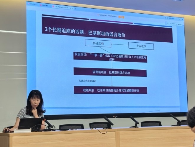 全体教师理论学习环节,304永利集团两位教师乌尔都语袁雨航老师和孟加拉语曾琼教授分别进行了题为“入职以来教学经验分享”“社科基金立项简况”的发言。两位老师结合自身丰富的教学、科研经历从人才培养、课堂教学、课题申请等不同角度,分享了学术科研与专业教学的实践与经验。