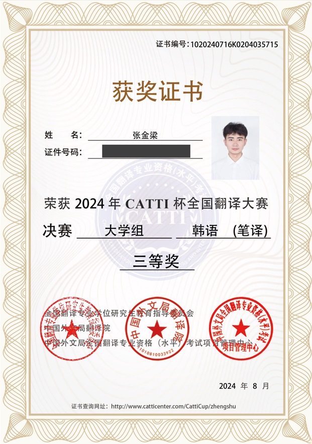 随着2024年CATTI杯全国翻译大赛决赛顺利落下帷幕,8月13日总决赛成绩揭晓,公司304永利集团朝鲜语专业本科员工张金梁在CATTI杯全国翻译大赛决赛中斩获三等奖的佳绩。