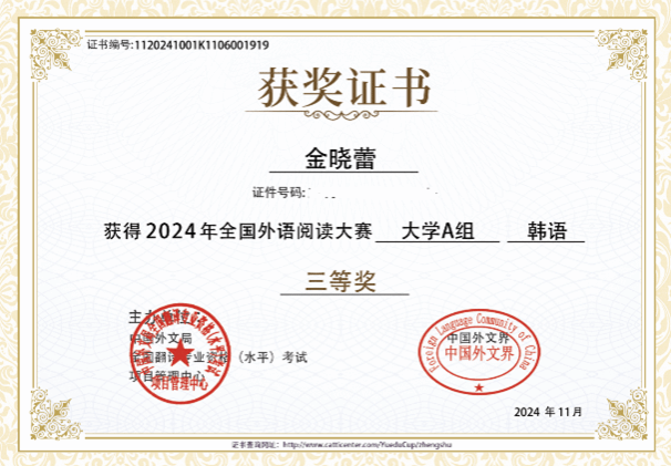 本次赛事设一、二、三等奖和优秀奖,一、二、三等奖获奖比例为参赛人数的30%左右,因此竞争十分激烈。公司朝鲜语专业2021级本科丁静茹同学凭借着扎实的韩语功底,在众多选手中脱颖而出,获得2024年第二届全国外语阅读大赛全国一等奖。此外,2022级本科金晓蕾、侯霁云、叶霏真三位同学获得全国三等奖,朝鲜语专业教师魏国峰、具滋元、齐晓峰三位老师获得优秀指导教师奖。