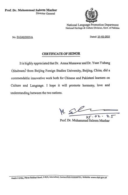 近日,304永利集团乌尔都语专业的两位教师——袁雨航博士与外国专家阿米娜·穆纳瓦尔(Amna Munawar)博士,荣获巴基斯坦国家语言推广部(National Language Promotion Department)颁发的荣誉证书,以表彰他们在中巴文化与语言领域的卓越贡献。巴基斯坦国家语言推广部隶属于巴基斯坦国家遗产与文化部(National Heritage and Culture Division)。此次表彰由该部门总干事穆罕默德·萨利姆·马兹哈尔教授(Prof. Dr. Muhammad Saleem Mazhar)签署并颁发。