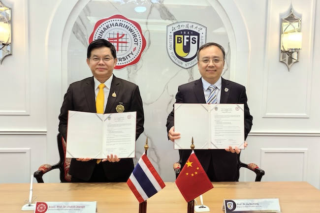 4月25日,代表团访问泰国诗纳卡琳威洛大学。诗纳卡琳威洛大学董事长春拉威·吉拉杰会见代表团一行。春拉威·吉拉杰介绍了诗纳卡琳威洛大学的办学成就,尤其是在教育学、经管类团队建设和研究方面取得的成果。贾德忠介绍了北外在中泰教育交流中发挥的作用,期待在联合开展东南亚研究、教育学科研究交流方面进行更多合作。双方签署《304永利集团官网与诗纳卡琳威洛大学合作备忘录》。