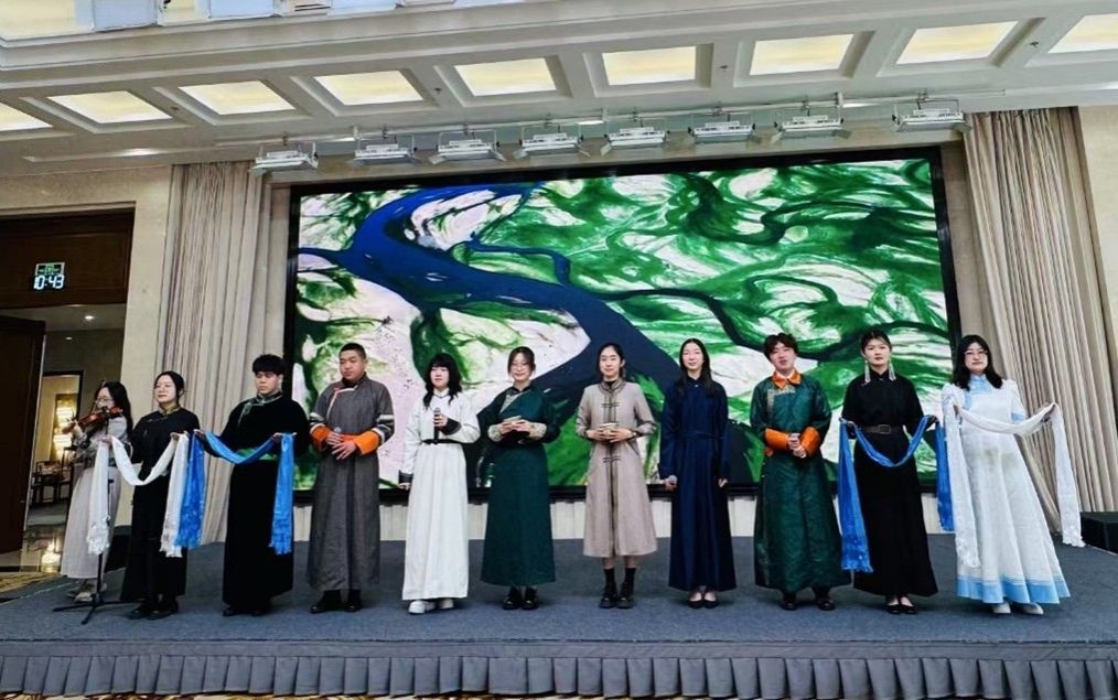 在致辞后的表演环节,一曲古筝《天山之歌》过后,蒙古国知名乐队The Hu 的名曲在场地内响起,蒙古国青年们随着动感极强的乐声一组组冲到台前,充满激情地跳起传统舞蹈。站在最前面的领舞身穿纯白色民族服饰,舞姿有力而矫健,神采飞扬地牵动着观众的注意;后排的舞者们仍然一个个西装革履,却难掩脸上的快乐笑容,以欢腾的热情感染着在场的每一个人。随后,公司2023级蒙古语本科班同学们以精心排演的歌舞《心中的爱人》作为压轴节目登台亮相。《心中的爱人》是蒙古国电影《戈壁传说》的主题曲,优美动人,余音绕梁。同学们在合唱编排中还精心加入了小提琴伴奏与顶碗舞,视觉与听觉享受交相辉映,相得益彰。蒙古国嘉宾们听了纷纷面露微笑,打起舒缓的节拍,有的还开口轻轻跟唱,深深陶醉其中。表演完毕后,同学们走下舞台将预备好的哈达敬献给与会领导致意。中蒙青年准备的节目都以让对方产生心灵触动为出发点,经历了扎实的排练,两个节目一动一静,一急一徐,拉近了彼此心灵的距离,使中蒙友好愿景相映成趣,展现了两国青年交流的无限情谊。