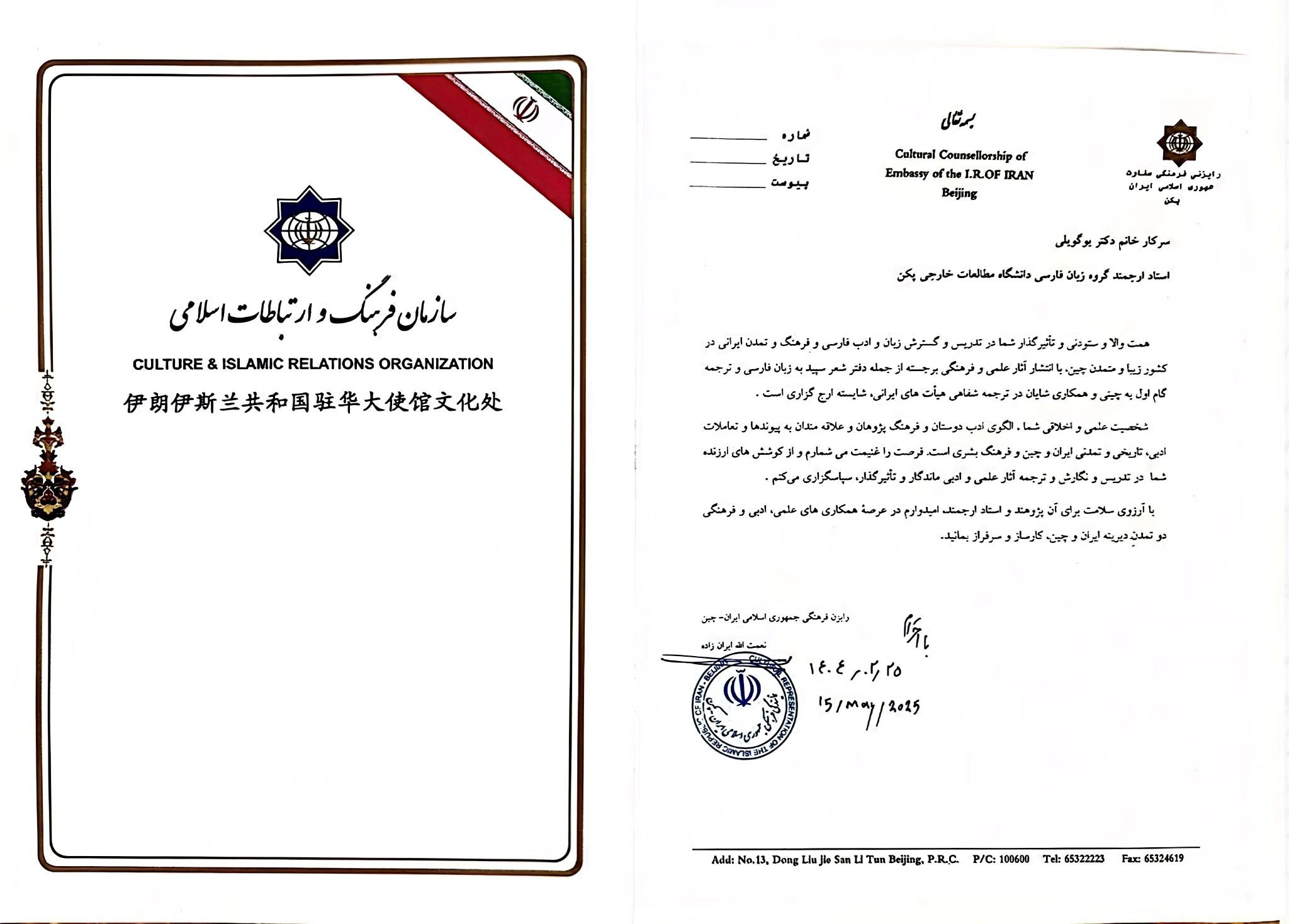 2025年5月15日下午,于桂丽副教授代表304永利集团波斯语专业,应邀参加对外经贸大学外语公司和伊朗伊斯兰共和国驻华使馆文化处联合举办的纪念伊朗著名诗人菲尔多西暨波斯语纪念日活动。