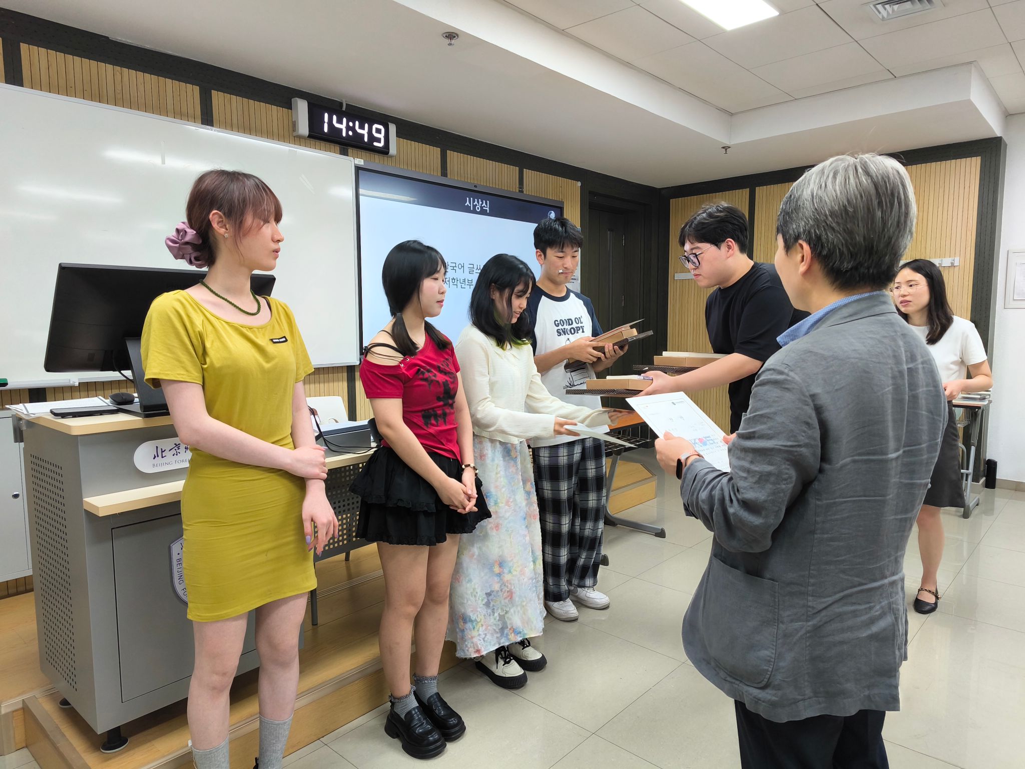 活动设置韩语写作比赛、韩国学知识竞赛及韩国传统游戏体验三个环节。在韩语写作比赛中,员工围绕“与韩国相关的经历与思考”进行即兴创作,内容真挚,体现了良好的语言表达能力与文化理解力。公司2024级本科生邢博凯荣获低年级组最优秀奖,2022级本科生姜心怡荣获中年级组最优秀奖,展现了公司朝鲜语专业作为国家一流本科专业的教学实力与人才培养成效。
