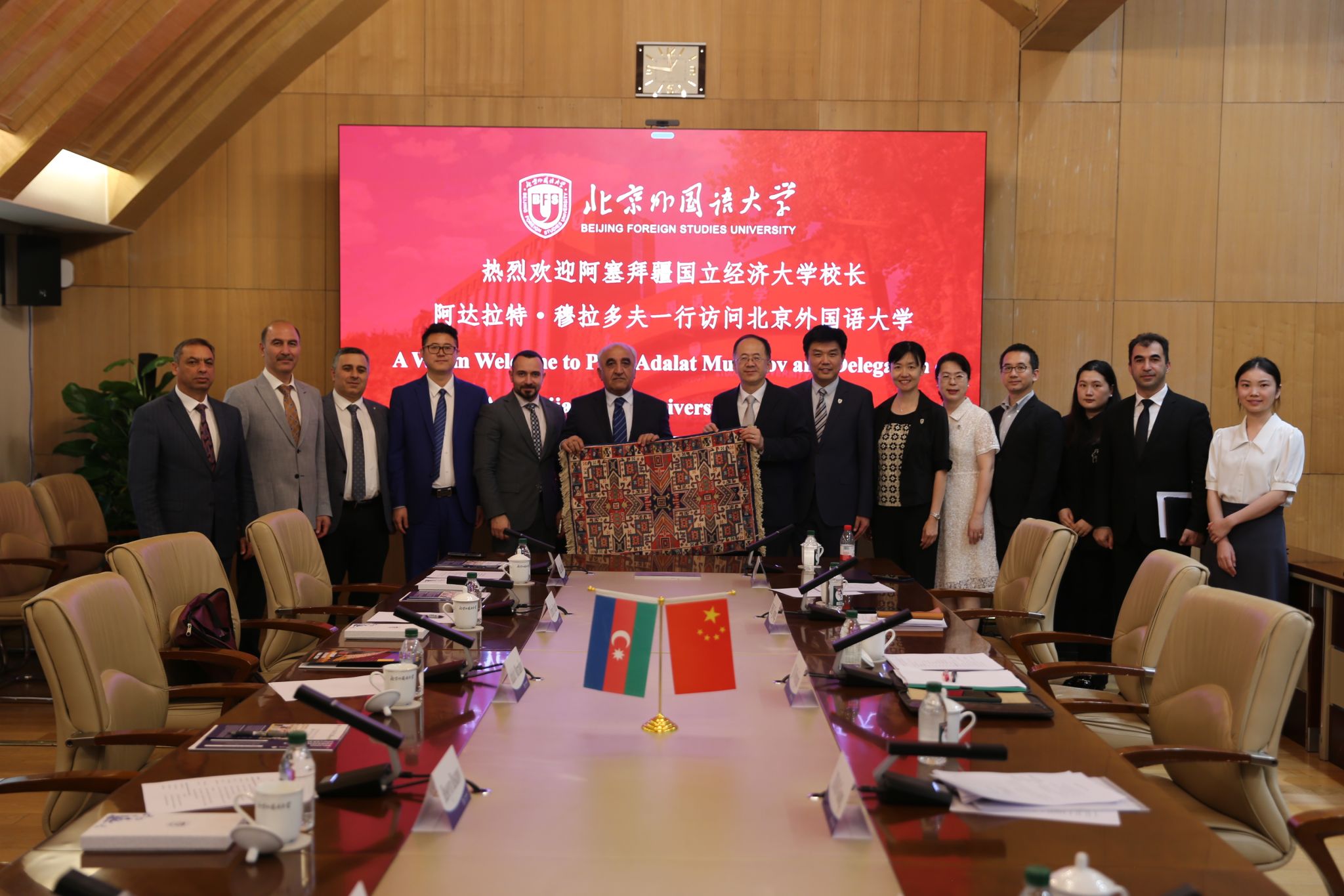 阿达拉特·穆拉多夫对北外的热情接待表示感谢,介绍了阿塞拜疆国立经济大学团队建设、教学科研、办学理念等总体情况,高度评价了北外在阿塞拜疆语和经济学人才培养方面的成就。他提议开展远程汉语教学、职工培养与互换等项目,整合两校在线图书资源,并表示十分期待与北外进一步加强合作往来。
