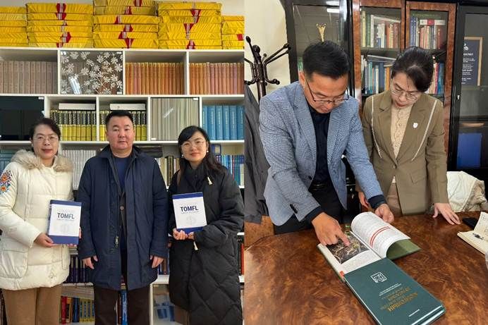 会见后,蒙古国立大学副董事长D.Zayabaatar教授带领代表团参观了蒙古国立大学图书馆、蒙古语水平测试中心,蒙古国立大学人文公司经理T.Eldev-Ochir教授向代表团详细介绍了该校人文公司下设外国语言文学各院系团队建设情况,并洽谈未来与北外进一步深入合作设想。
