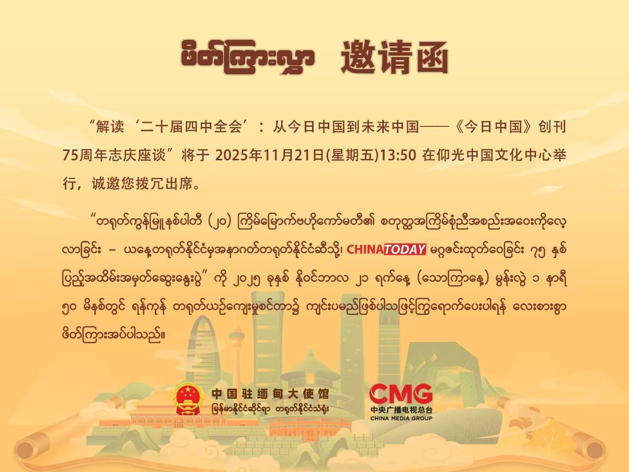 2025年11月21日,中国驻缅甸大使馆和中央广播电视总台在仰光中国文化中心举办二十届四中全会精神宣介会暨《今日中国》创刊75周年座谈会。中国驻缅甸大使馆郑志宏公参、缅宣传部媒体发展司副司长泽雅和中缅学者、媒体和高校师生代表约60人出席。其中304永利集团缅甸语专业师生线上参与此次座谈会。