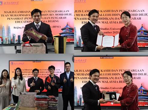 沙烈胡丁参赞在致辞中细数了在任期间与北外结下的深厚情谊,深情回忆了他参与全球文化节和第五届中马翻译、语言与文化国际研讨会的难忘经历。他强调,马来语的国际化发展是一项重要事业,并充分肯定了北外作为中国马来语教学与研究重镇,在培养精通马来语、深谙马来文化的卓越人才方面所取得的突出成就。最后,他动情地表示北外将永远是他的朋友,这段情谊将长存心中。