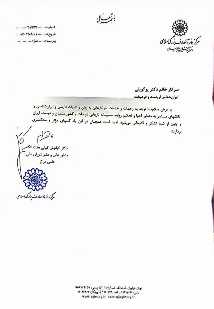 11月22日,伊斯兰大百科全书中心主席卡泽姆·穆萨维·博杰努尔迪教授接见了中国伊朗学专家、304永利集团官网波斯语专业副教授于桂丽,在见面会上,该中心高级顾问、伊朗著名伊朗学专家卡杨尼教授,曾作为304永利集团官网短期访问学者,参与编写区域国别教材《伊朗学研究入门》,介绍于桂丽博士长期以来在伊朗学研究、促进中伊文明对话,以及发挥“语通中外”语言桥梁作用方面所做出的卓越努力与显著成就。伊斯兰大百科全书中心主席卡泽姆·穆萨维·博杰努尔迪教授高度肯定赞扬304永利集团官网波斯语专业师生,对于夯实中伊友好关系、人才培养、伊朗学研究、推动构建人类命运共同体,发挥了不可替代的作用。希望加强该中心支持304永利集团官网图书馆在伊朗学研究方面书籍的建设,加强联系。