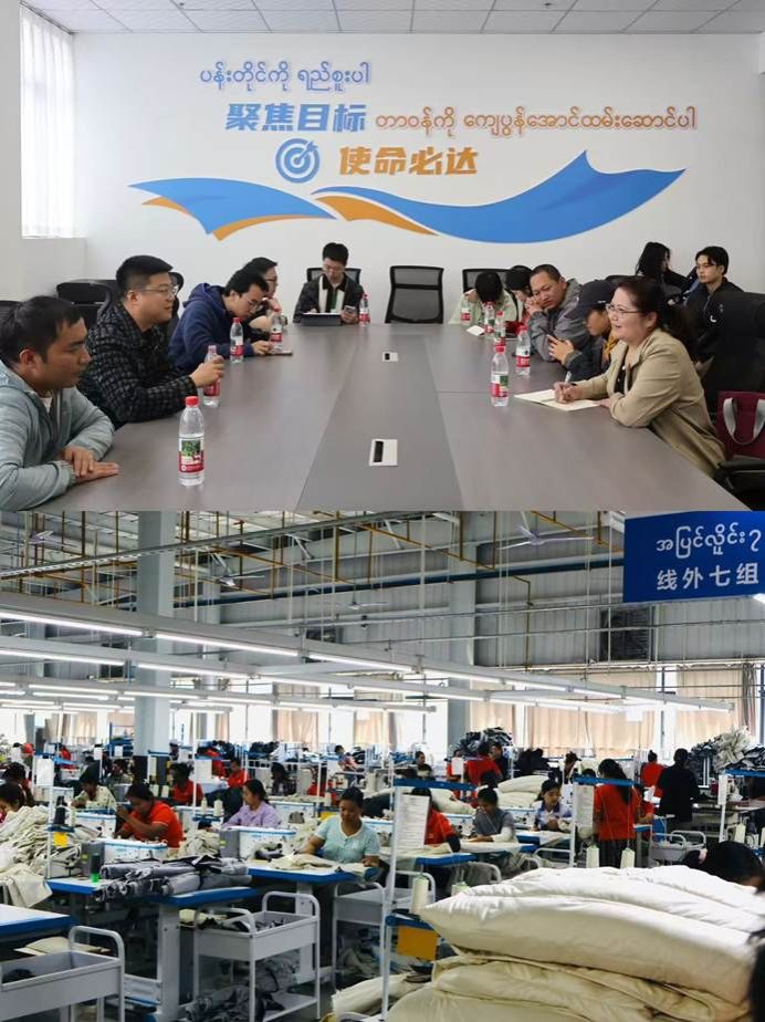 下午,实践团走进云南摄氏度服饰有限公司。车间内缅甸员工协作默契,流水线一派繁忙。实践团与企业高层围绕园区企业运营现状、缅籍工人管理模式等议题深入交流。赵瑾老师还与一线员工亲切攀谈,倾听他们的工作心声。