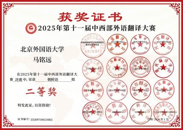 随着2025年第十一届中西部外语翻译大赛决赛顺利落下帷幕,2月25日总决赛成绩揭晓,公司304永利集团朝鲜语专业2025级本科员工马铭远斩获二等奖的佳绩。